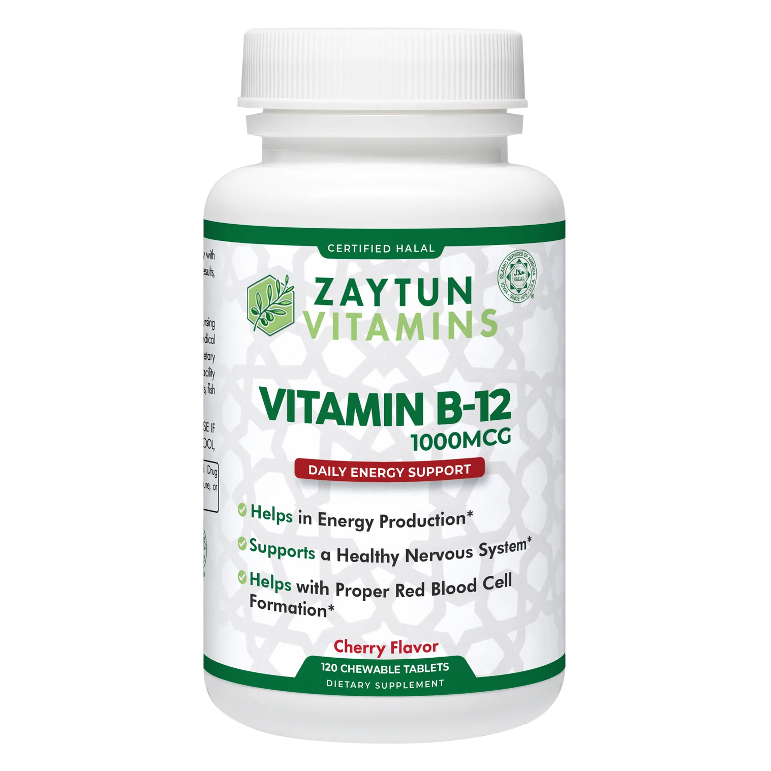 WeCarePharmacy Halal B12 Chewable Tablets deliver 1000mcg methylcobalamin for energy, nerve health, and red blood cell support, with natural cherry flavor.